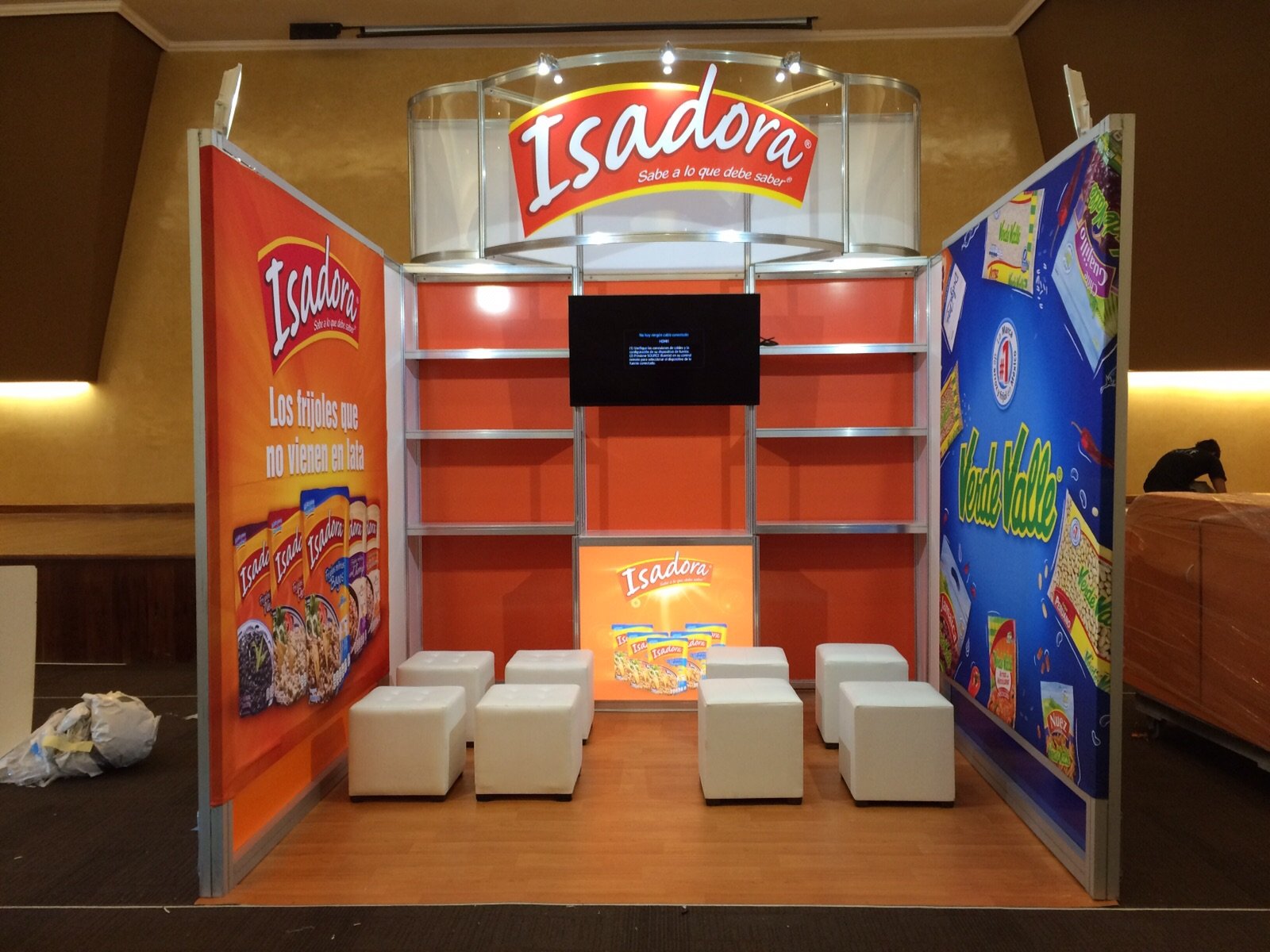 Diseño de Stand 6×3 para Nestle con paredes en Tela sublimada-Sarga a 2.5M, Repisas, Modulo Desmostrador con Puerta & plasma de 40″. En Kristal-B2B @elstand,#StandsenCancun