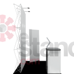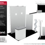 Stand a 2.95 metros de altura Maxima  Incluye: 1 Estructura POPUP , 2 Lamparas. 1 Lona de 225 x 295 cm 1 Counter de 1 x 50 a 1m-Octanorm. Opcional 1Estructura Rollup & 1 Impresion 80×200 cm 1 Folletero 9m2 de piso laminado 1 pantalla de plasma de 32” 1 mesa periquera con 2 Sillas