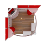 3.5 metros de altura Incluye: 4 imágenes de 95×86 cm. 2 imagenes de 217×45 cm. 2 imagen de 107x 86c m. 1 Counter Curvo. 2 counters con área de guardado y puerta.2 Arreglos de Bamboo & Piedra de Rio. 1 Folletero. Copete & Curvas cubiertas en vinil de color. Opcional 9m2 de piso laminado. 1 pantalla de plasma de 32”. 1 mesa periquera con 4 sillas.
