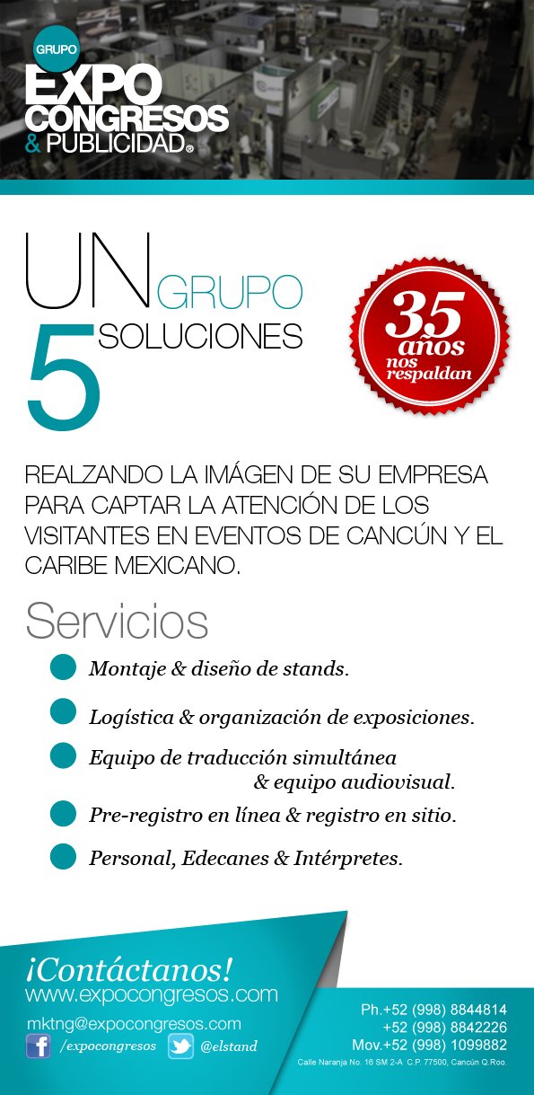 Desde hace mas de 35 años Grupo Expocongresos( www.expocongresos.com) detecto una necesidad en Cancún & El Caribe Mexicano, nos dimos cuenta que era necesario contar… Leer más »35 años de Grupo Expocongresos & Publicidad