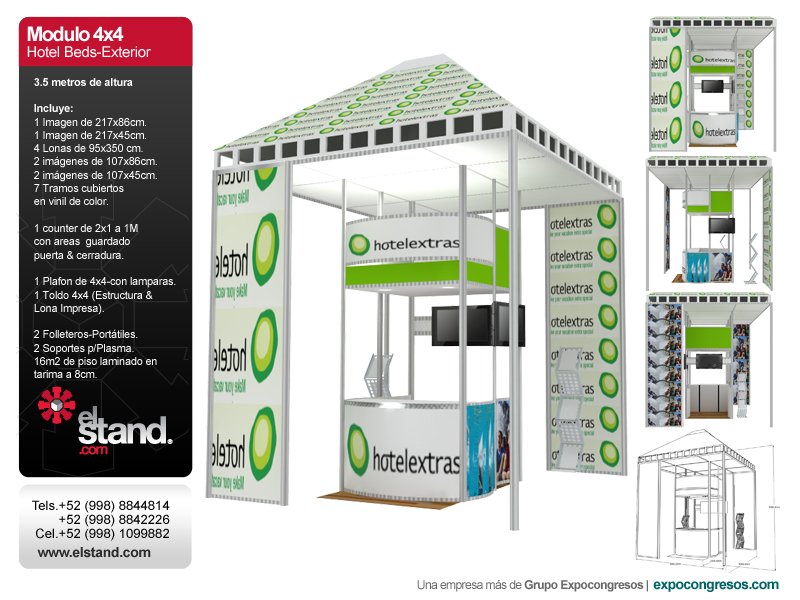 Modulo 4×4 Hotel Beds-Exterior 3.5 metros de altura Incluye: 1 Imagen de 217x86cm. 1 Imagen de 217x45cm. 4 Lonas de 95×350 cm. 2 imágenes de… Leer más »Modulos para Plazas en Cancún- 4×4 Hotel Beds-Exterior